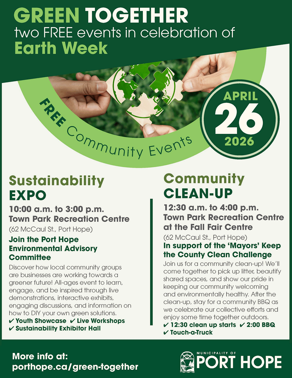 On Sunday, April 26, the Municipality of Port Hope is getting “Green Together” with two events focused on sustainability and local action in celebration of Earth Week.