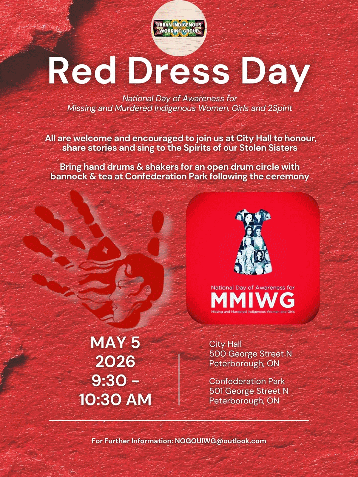 This year’s Red Dress Day commemoration from 9:30 to 10:30 a.m. on May 5 will feature a prayer and drumming ceremony outside Peterborough City Hall at 500 George Street North, followed by the sharing of stories, bannock, and tea in Confederation Square across from city hall.